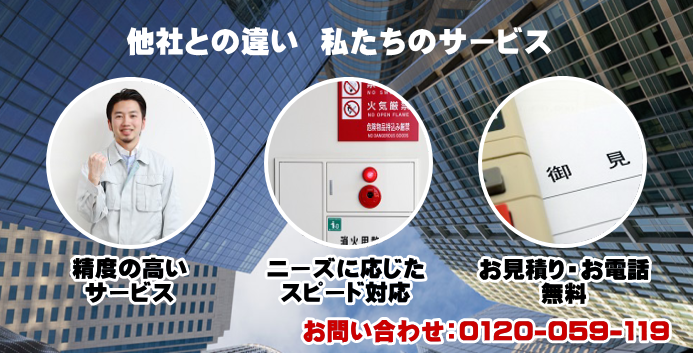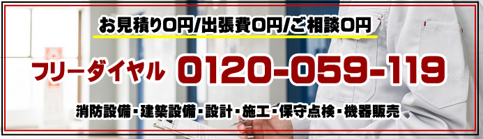 一般住宅/マンション/アパート/戸建て/店舗/ビル/不動産/会社/オフィス/事務所/工場/学校/幼稚園/保育所/介護施設/病院/映画館/スーパー/コンビニ/市役所/公共施設/管理会社/商業施設/消防署/消防局/火災報知器/警報設備/非常警報設備/非常警報器具/漏電火災警報器/消火器/消火栓/消火設備/スプリンクラー設備/消防/連結送水管/自家発電設備/排煙設備/避難はしご/水漏れ/故障/修理/交換/誤作動/異音/点検/調査/書類/提出/代行/保守/非常誘導灯/救助袋/二酸化炭素消火設備/ガス漏れ警報設備/ハロゲン化物消火設備/口コミ/評判/出張無料/見積無料/求人/協力会社/提携/安い/最安値/専門