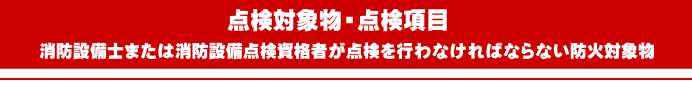 消防設備士または消防設備点検資格者が点検を行わなければならない防火対象物・延べ面積1,000u以上の特定防火対象物(デパート、ホテル、病院、飲食店、地下街など)・延べ面積1,000u以上の非特定防火対象物で消防庁または消防署長が指定したもの(工場、事務所、倉庫、共同住宅、学校など)・屋内階段(避難経路)が1つの特定防火対象物